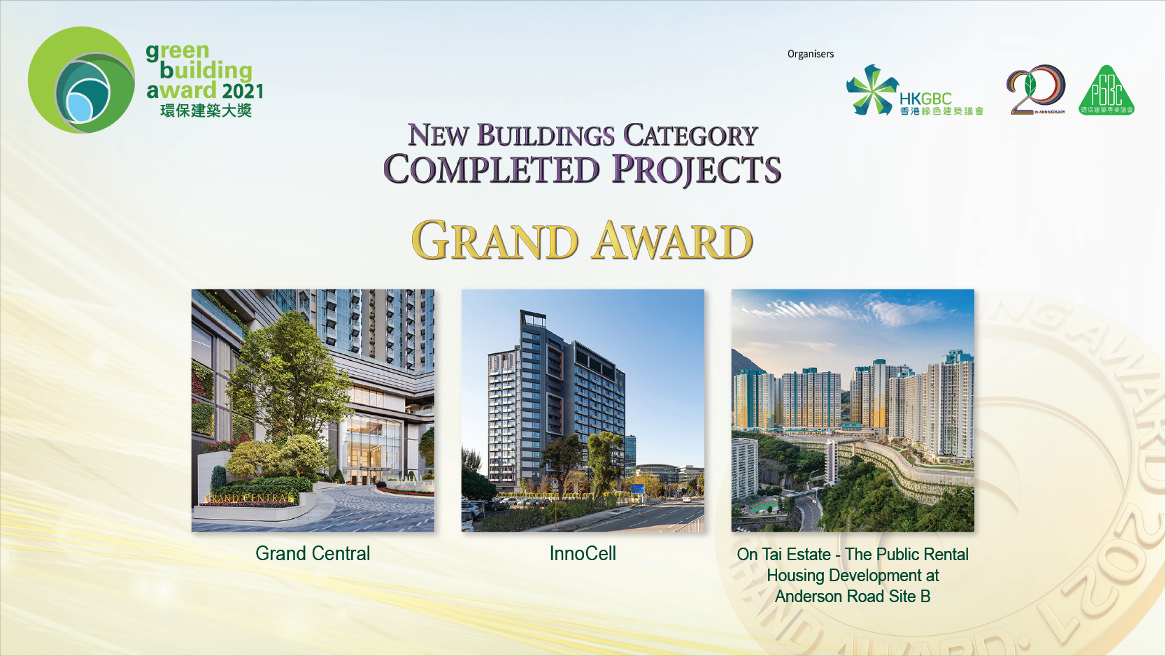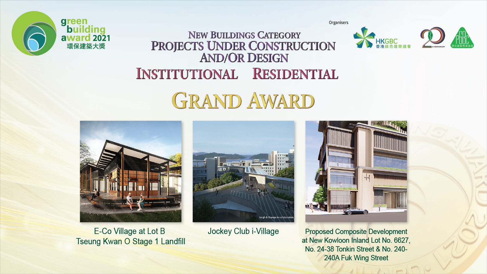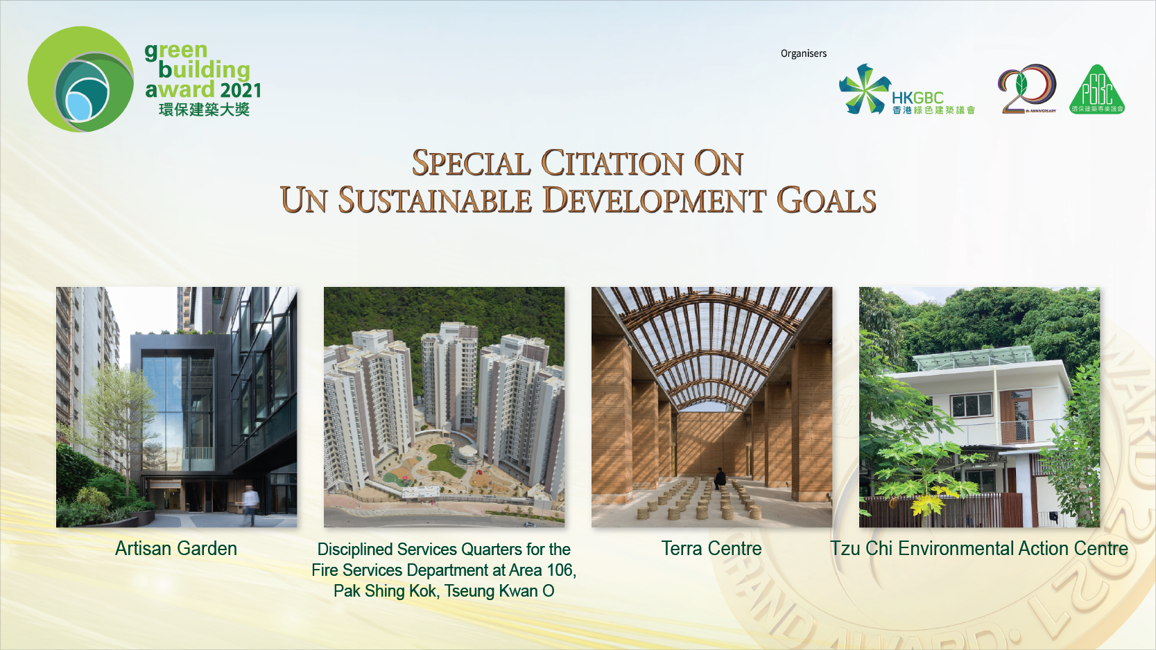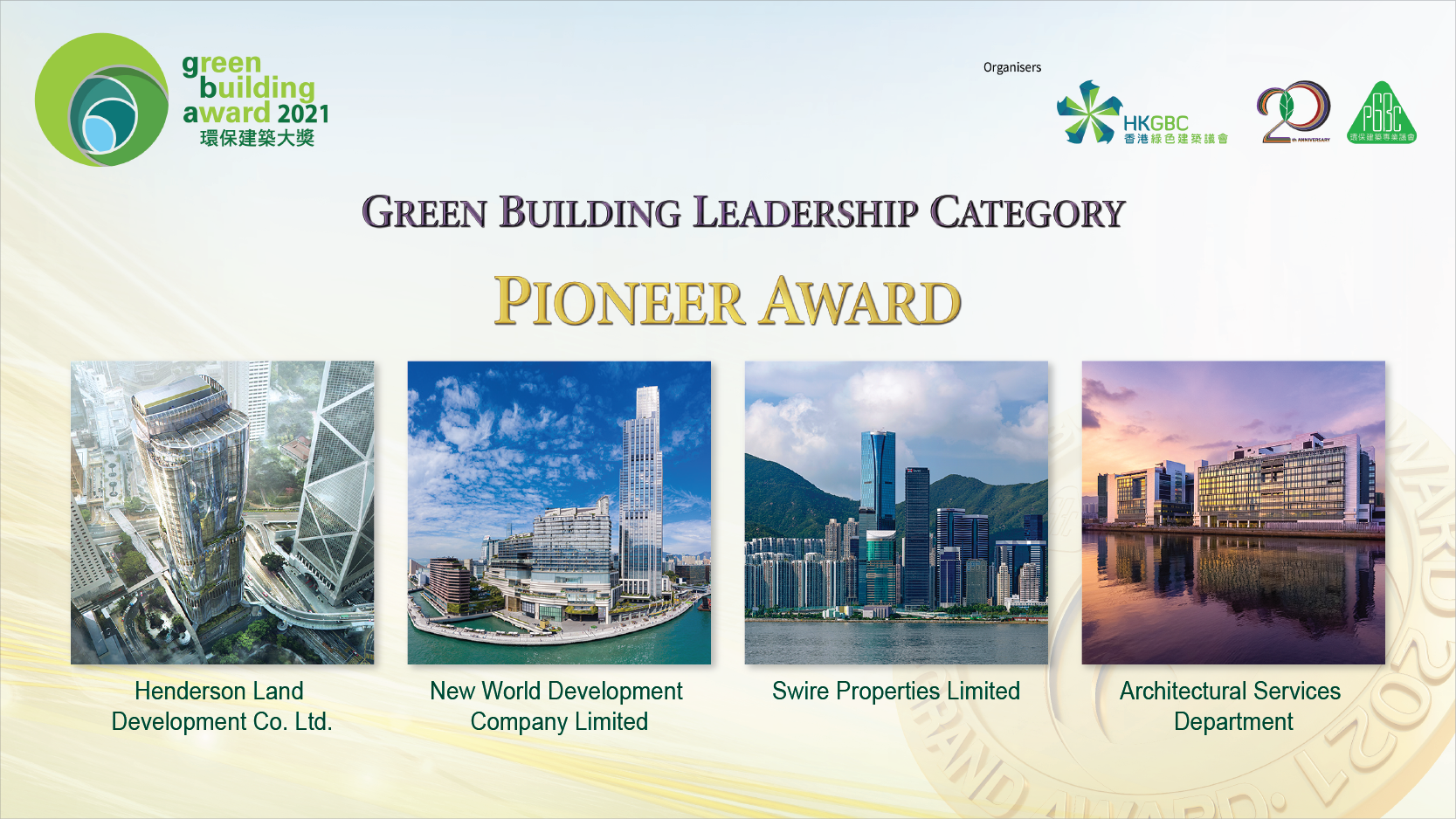 GBA 2021 received an overwhelming support from the industry with a record-breaking number of 100 nominations. Among the 80 Finalists, 39 Award Winners were announced at the Ceremony which included 4 Pioneer Awards, 10 Grand Awards, 23 Merit Awards and 6 Special Citations on United Nations Sustainable Development Goals.